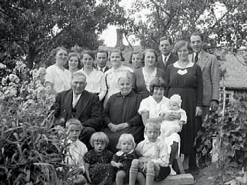 Salomons Bengts guldbröllop. Fastarp 3, Tvååker. Guldbröllopsparet Bengt Johan Andersson och Augusta Salomonsdotter, omgivna av gäster och släktingar. Intill paret sitter Judit Magnusson. I övrigt saknas namnuppgifter.