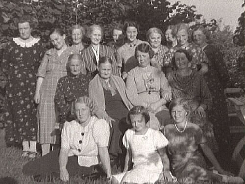 Kalas. Dambjudning? Från v bakre raden:1 Ester Larsson, 2 ?, 3 ?, 4 ?, 5 Gerda Svensson, 6 Elin Rosenqvist, 7 Albertina Wallenius, 8 Junis Bengtsson, 9 Josefina Bengtsson, 10 Junis Hammar, 11 Anna Britta Abrahamsdotter, 12 Maria Caspersson, 13 Anna Nilsson, 14 Svea Liljegren, 15 Märta Wallenius, 16 Ingeborg Liljegren, 17 Anna Larsson. Foto från omkring 1936.