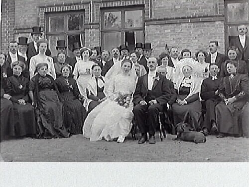 Bröllop. Brudpar och bröllopsgäster fotograferade utanför ett tegelhus. (8 bilder). Osäkra uppgifter om brudparet. Bruden kan vara Johanna Lovisa Carlsson, Fastarp 2, född på Speletorpet, torp under Fagared: Brudgummen Johan Victor Ljungdahl, född på Kärret i Ljungby. Bodde vid denna tid på Halvbondagärde. F d korpral vid Skånska Dragonregementet. När paret utflyttade till Kungsbacka 1908, hade han titeln poliskonstapel. Huset bakom troligen byggmästare Wallenius fastighet (Första tegelhuset i Tvååker) vid gamla mejeriet i Tvååker. Paret längst till höger är Johan Carlsson och hans fru Hulda Carlsson.