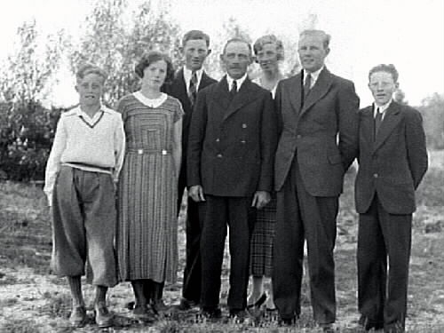 Familjen Karl Larsson uppställd för fotografering utomhus. Barn: Margareta, (bakre raden t h) Carl-Ragnar, (främre raden 2:a fr h) Anna Maria, (främre raden 2:a fr v) Lars Folke, (bakre raden t v) Stig Allan (främre raden t h) och Kurt Agne (främre raden t v).