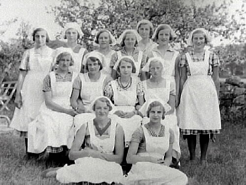 En grupp skolköksflickor fotograferade utomhus. Flickorna har ljusa förkläden och huvuddukar.