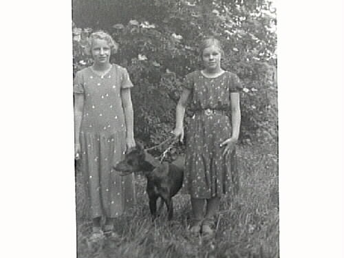 Inga Andersson och Brita Nordström samt en hund. Bilden är tagen utomhus.