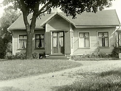 Folkskollärare Winqvists villa på Fastarpsvägen, Tvååker. Entrén är ovanlig eftersom den inte bara har tvåbladig dörr utan även helt fönsterlösa "dörrluckor".