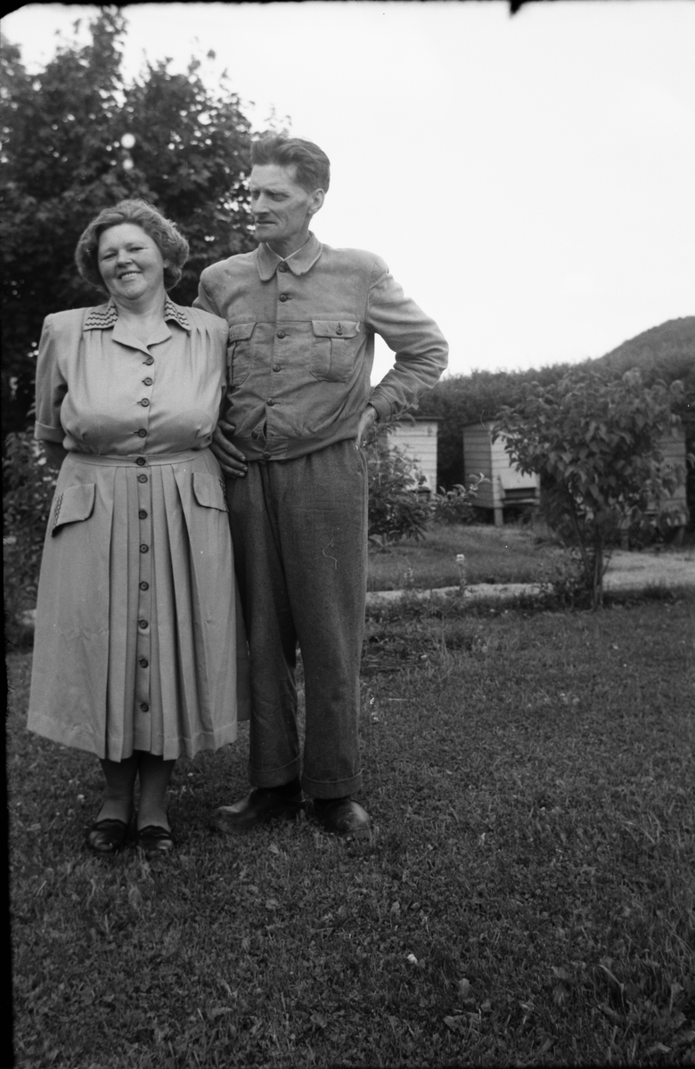 Evelina och Ernst Larsson i Utmossen, Fageråkra, står i trädgården med syrener och bikupor i bakgrunden. Hon bär en helknäppt klänning med lagda veck och dekorer av vågiga band på krage och ficklock. (Se även EA0392)