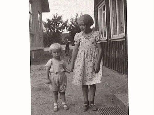 Två barn, fotograferade utomhus. Fastarpsvägen, Tvååker. 1940 ca.