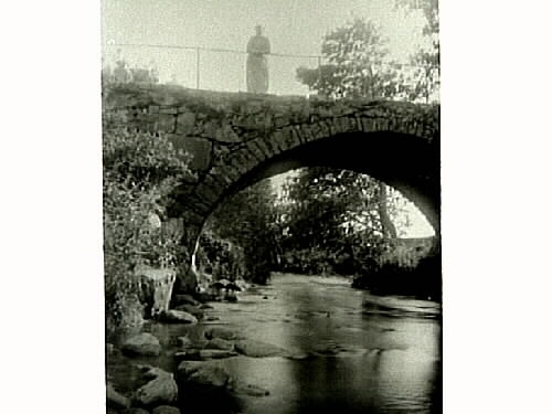 Den gamla bron över Tvååkers kanal. Fotot taget vid tomtgränsen till fotografens föräldrahem; fastigheten "Vilan", Fastarpsvägen 15. Hit körde familjerna med häst och vagn med stora bykekar och sköljde sin tvätt. De stod ute i vattnet med en bock och klappträ.