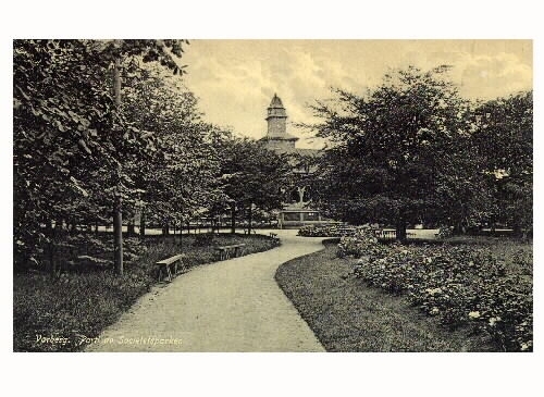 Vykort, "Varberg. Parti av Societetsparken" med societetsrestaurangen i fonden. Enkla träbänkar står utmed grusgångarna.