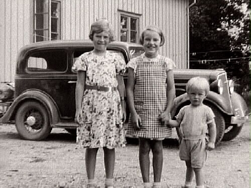 Tre barn fotograferade utomhus. I bakgrunden skymtar en bil, (Nils Andersson, "Gästis", hade en T-Ford tillsammans med en god vän, se Tvååkersboken sidan 152). Foto från 1938-1939. Fr v Marianne Wallenius, sondotter t J D och Albertina Wallenius, Kerstin Karlsson, "Spigarns" och Rolf Mattsson. 1928 ca