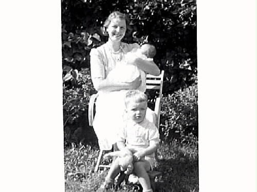Familjebild. Fru Bergendahl och barnen fotograferade utomhus.