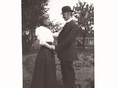 Finklätt ungt par fotograferade utomhus i en trädgård eller park inhägnad med trästaket. De heter Amelie och Johan Winqvist (bror till fotografen).