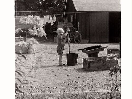 Barnlek. Litet barn leker ute på en gård där det bl a hänger tvätt. Kan vara charkuterist Gustaf Petterssons uthus där slaktning skedde i just den här porten. .
