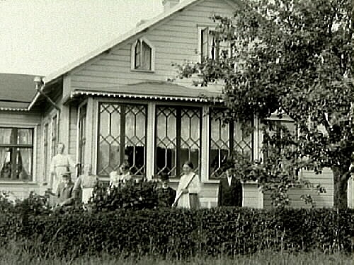 Exteriör. Villa, Fastarpsvägen, Tvååker. Några personer befinner sig i trädgården och vid huset.