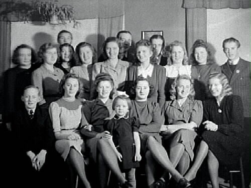 Gunvor Johanssons 20-års dag. Gunvor och en stor skara vänner och bekanta. Bakre raden: 1 Sven Göök, bagare, 2 Carl Olof Reuterberg, SJ-anställd, 3 Rune Elisson. Andra raden: 4 Ingeborg Liljegren - Roos, 5 Anna Larsson - Elisson, (Rune), 6 Evy Carlsson - Pettersson, 7 Ester ... , Dagsås, 8 ?, 9 Gullie Hjalmarsson, 10 Evy Bengtsson, Olsegården, 11 Karin Andersson, Hult, Grimeton, 12 Allan Bäckman, SJ-anställd, 13 Hans Svensson, "Baskens", 14 Astrid Albrektsson, 15 Lisa Josefsson, hårfrisörska, 16 Berit, d t "Tullan" Svensson, "Baskens", 17 Gunvor Johansson, Kafét, 20-åringen, 18 Gullie Fagenheim, Fagared, 19 Disa Andersson - Svensson, Gästis.