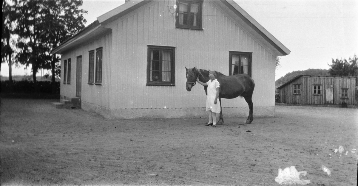 Evelina Larsson på Utmossen, Fageråkra står med en häst vid husgaveln. I bakgrunden ett uthus med pulpettak och omålad fasad.