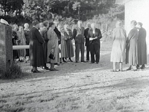 Titel: Läraren Reinhold Linder och hans första klass i Åhs skola (år 1884) firar 60-års jubileum.