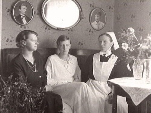 Diakonissan Valborg Kihlberg på hembesök. Hon sitter i en soffa tillsammans med två kvinnor.