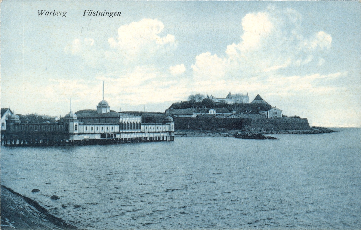 Kolorerat blåtonat vykort, "Warberg. Fästningen." Kallbadhuset, Barnens badstrand och fästningen. Vykortet har en perforering i vänsterkanten, troligen efter att ha suttit samman med fler vykort.