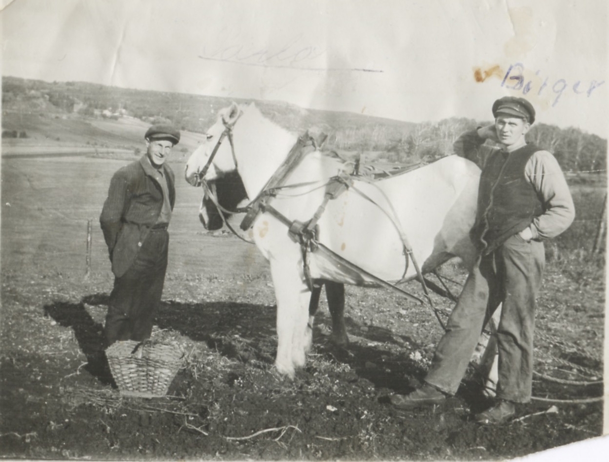 Tollered/Heljered okänt årtal. Från vänster: Herman Gustafsson, Tollered, och Birger Pettersson (1891 - 1970), Högen. Männen står vid två arbetshästar på åkern. I bakgrunden ses Backen.
