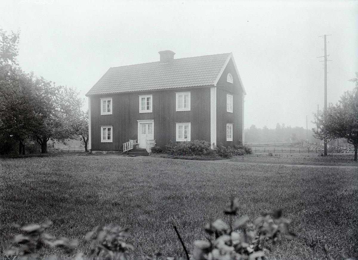 Mangårdsbyggnad med elstolpar i trä till höger.