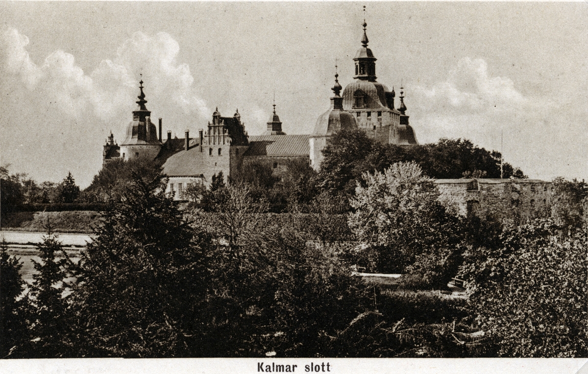 Vykort med Kalmar slott utifrån stadsparken.