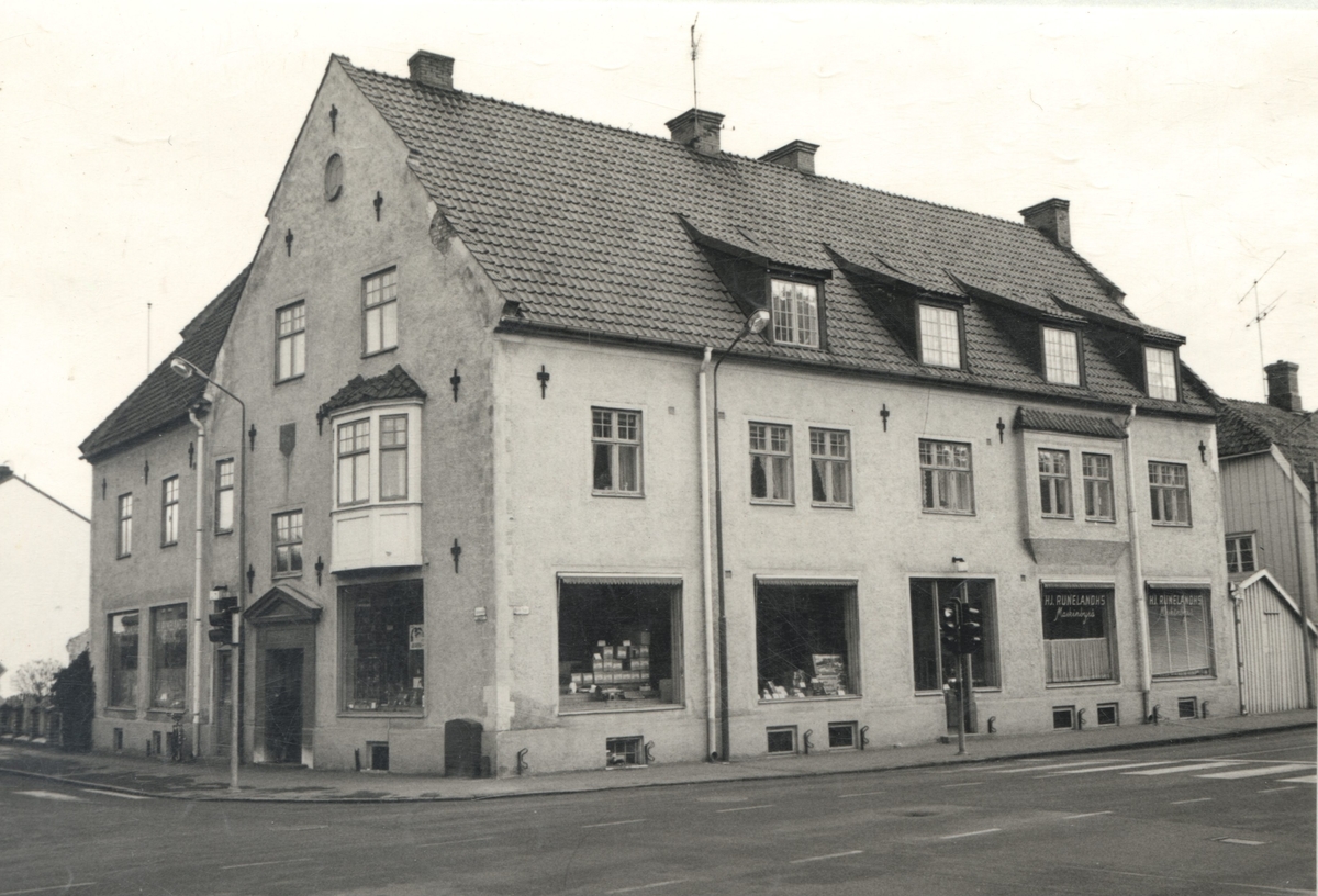 Runelandhs Maskinbyrå, i en byggnad med ankarslut, burspråk och takkupor.
