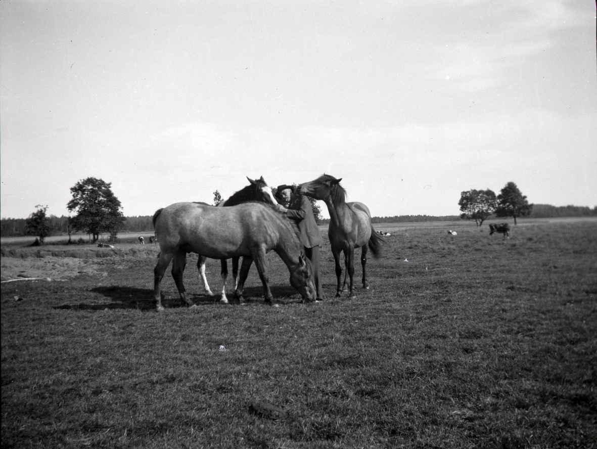 Titel: Hugo Hammarskjöld underhåller några hästar på Sjöängen vid Tuna gård.