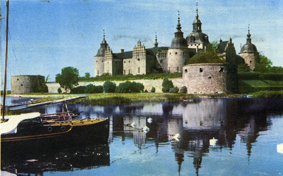 Vykort med Kalmar slott och fritidsbåtar vid Slottsfjärden. Sommaren 2022 byggdes en filial till gästhamnen på denna plats.