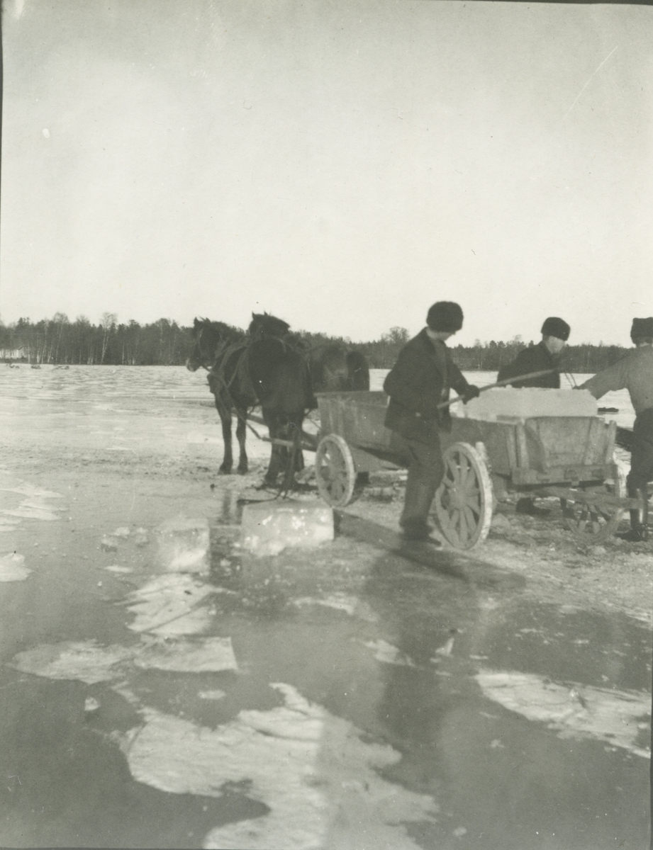 Folk som lastar isblock på en vagn på Tunasjön i närheten av Tuna gård. Det lades upp ett lager av is mellan mejeriet och matboden. Isen täcktes med sågspån och där hämtades is för hushållsbehov.