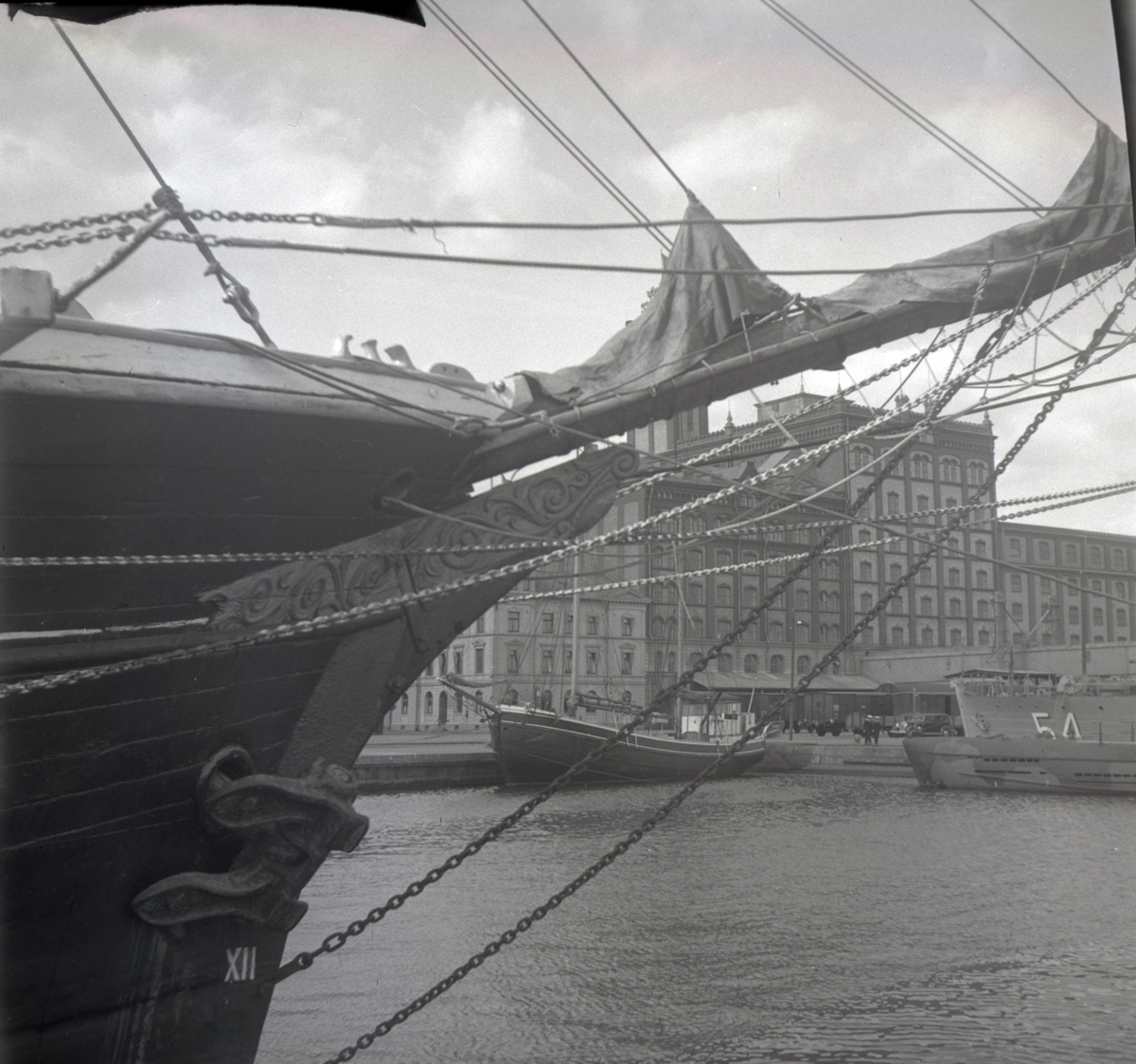 Tullhamnen i Kalmar hamn. Segelfartyg med ångkvarnen i bakgrunden.