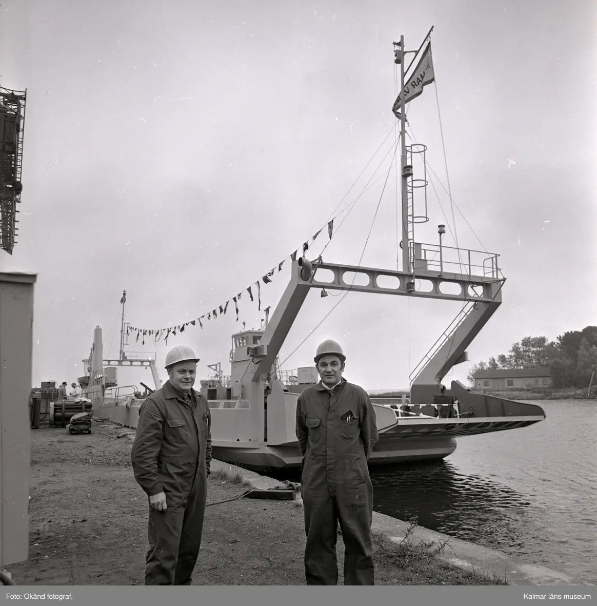 Två män som står framför vägverkets färja 296 på varvet i Kalmar.