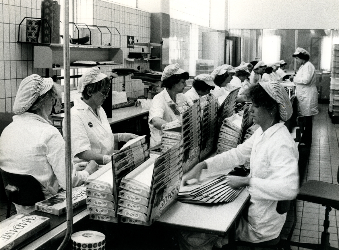 En bild av könsfördelningen på chokladfabriken med idel kvinnor i arbete.
