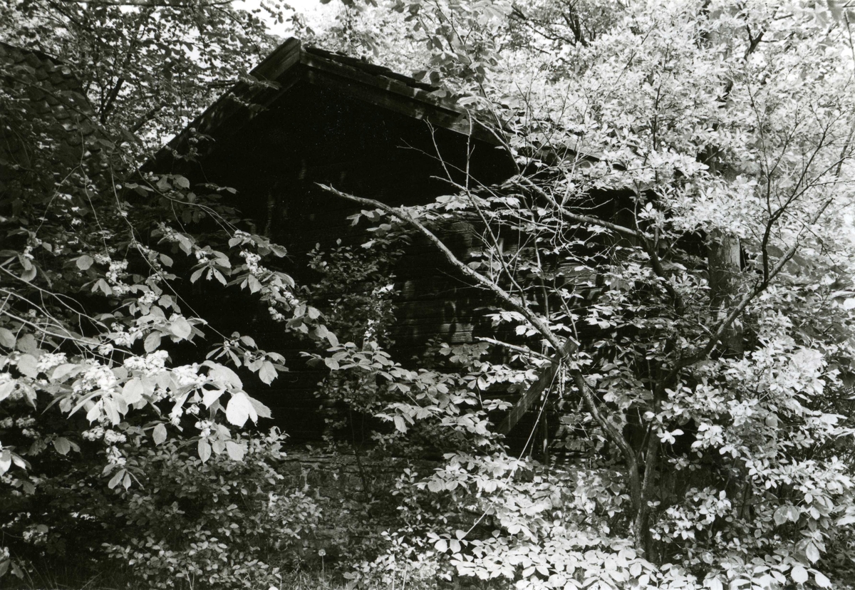 En ekonomibyggnad bland grönska i kvarter Häggen nummer 2.