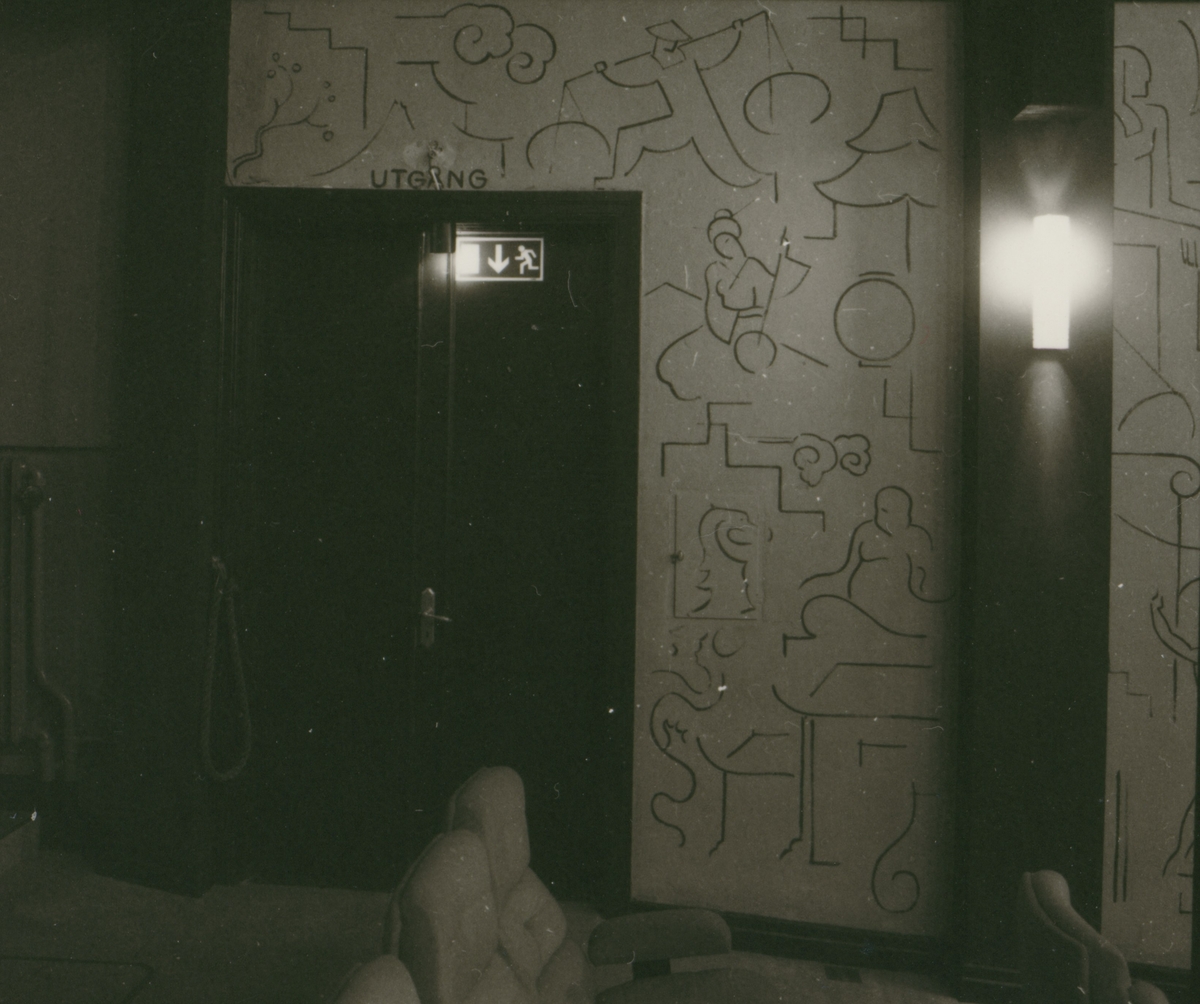 Biografbyggnaden med glasveranda och balkong. Entrén till Saga vänster i bild.