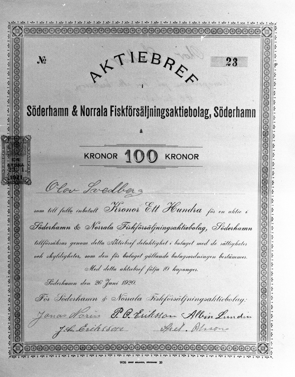 "Aktiebreef i Söderhamn & Norrala Fiskförsäljningsaktiebolag" från Gävle Fisk