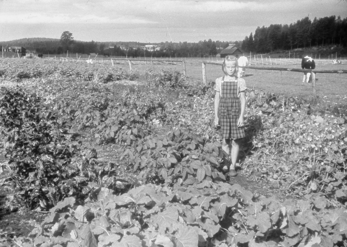 Flicka stående i ett trädgårdsland