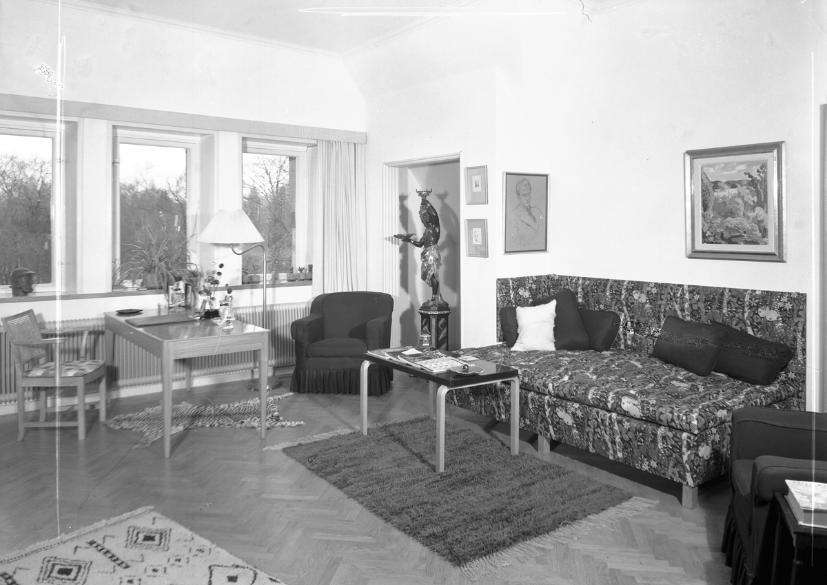 För boken "Svenska Hem i ord och bilder". Hos Direktörsassistenten vid Gefle Ångväveri Bengt Müller. Vardagsrummet med en tavla av Grünewald hänger över soffan klädd med Josef Franks "Tre öar i Svarta havet"