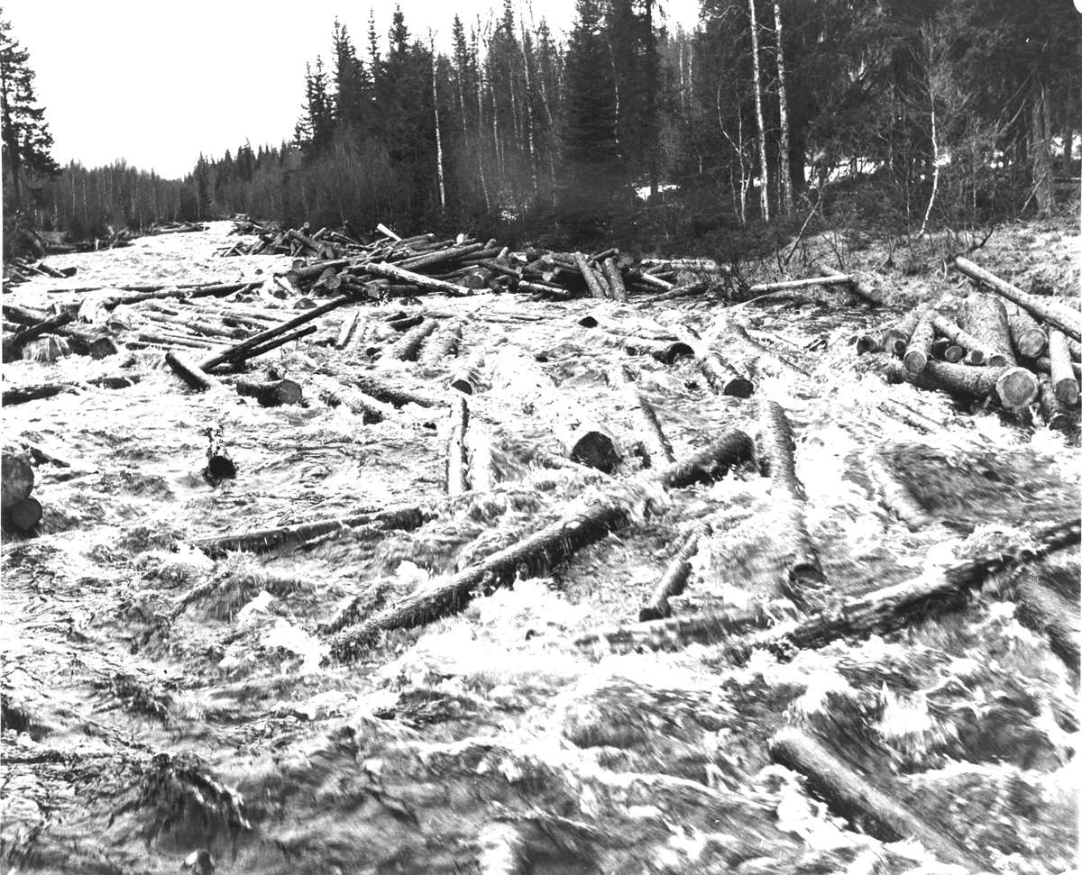 Timmer och massaved förs av vårfloden utför bivattendragen ned till Dalälven. Den 9 juni 1950. Korsnäs AB är ett av Sveriges ledande skogsindustriföretag som tillverkar kartong, säck- och kraftpapper, fluffmassa till hygienprodukter och sågade trävaror.