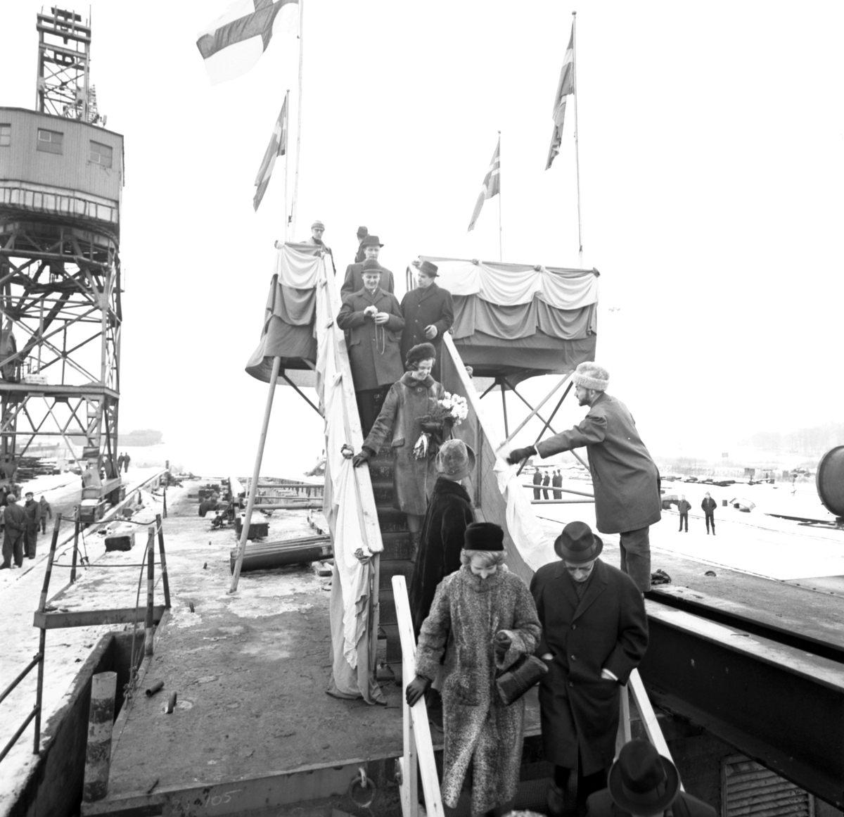 Den 19 februari 1965. Gävle Varv. Sjösättning av båten M/S Tauna.