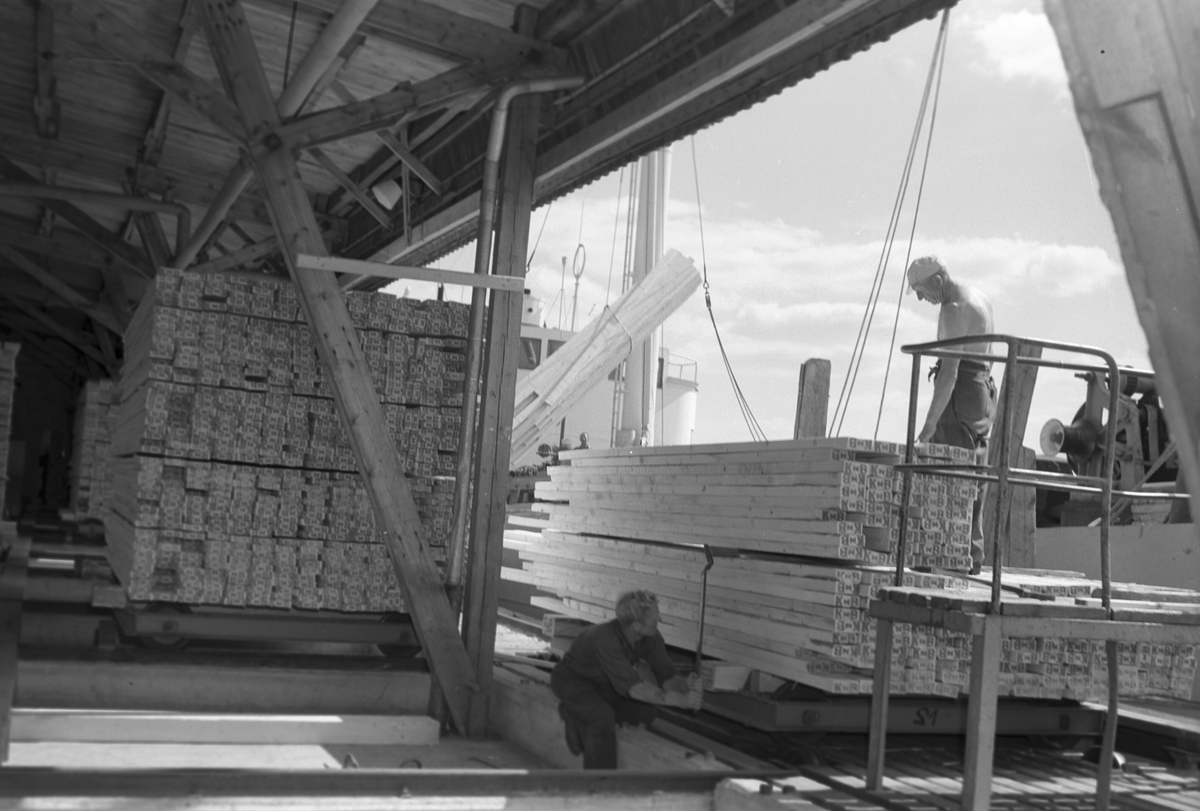 Titel: Sågverket, virkesmagasinet, lastning. Korsnäs AB är ett av Sveriges ledande skogsindustriföretag som tillverkar kartong, säck- och kraftpapper, fluffmassa till hygienprodukter och sågade trävaror.