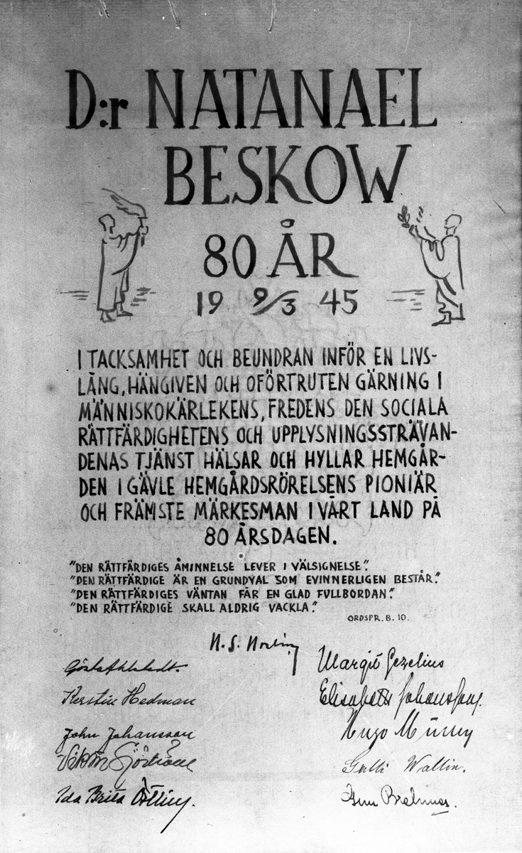 Gratulationstavla till doktor Natanael Beskows 80-årsdag. 9 mars 1945.