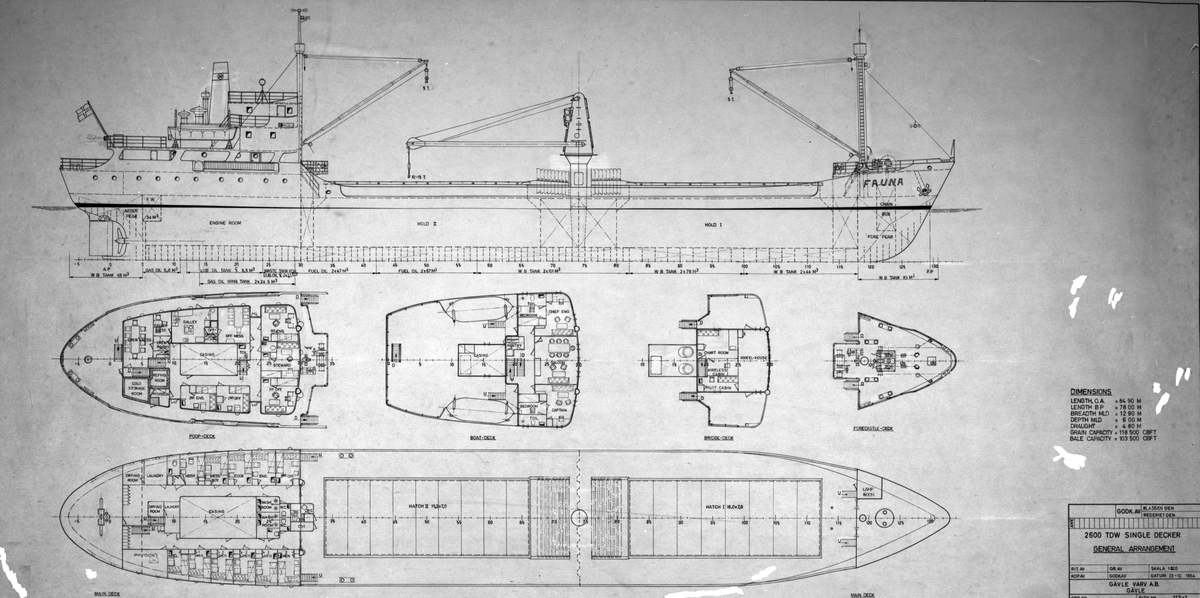 Den 23 mars 1965. Gävle Varv. Ritning av båten M/S Tauna.