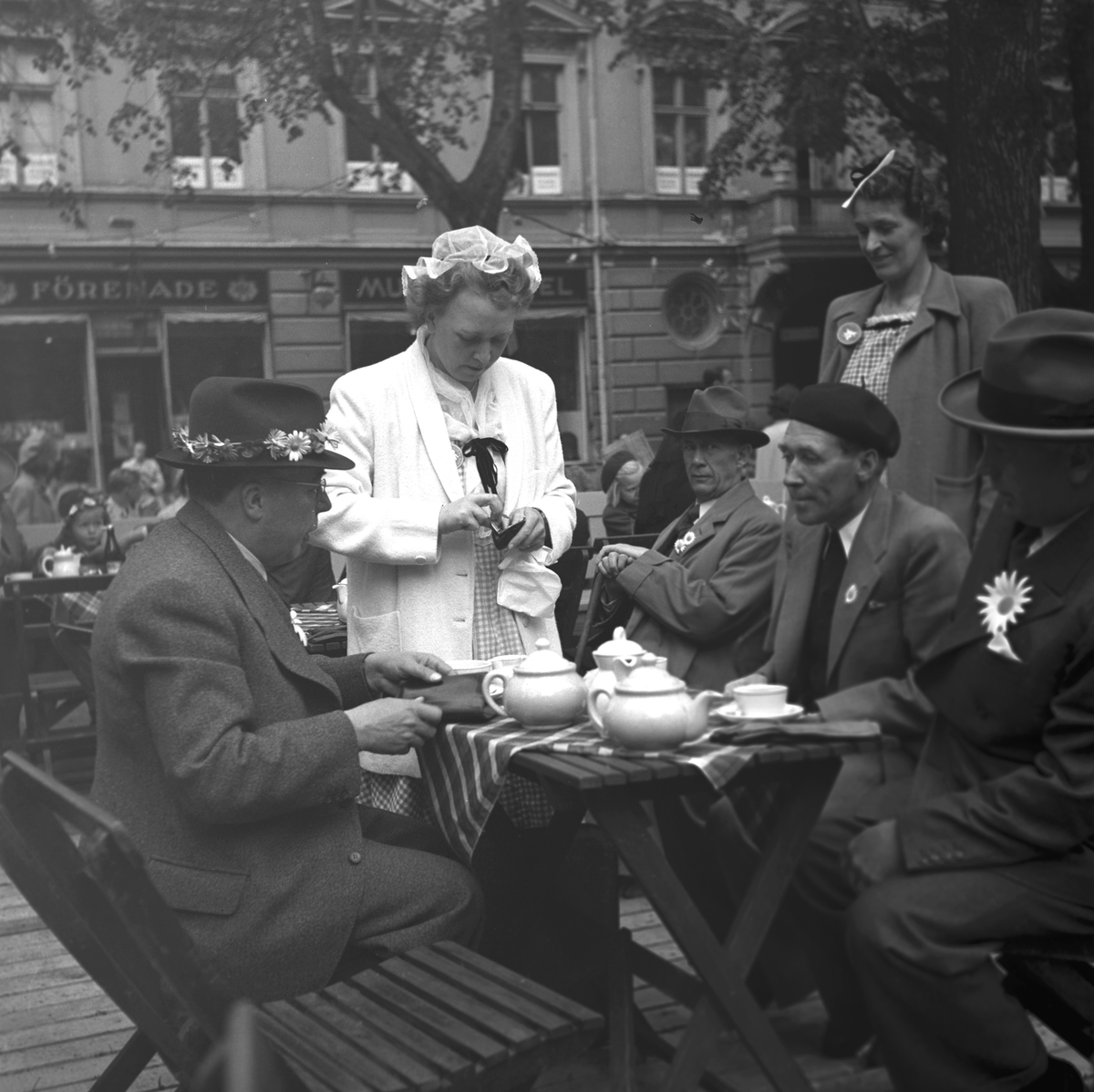 Barnens Dag. Mannen med den blomsterprydda hatten är Borgarskolans rektor Sven Karsberg.