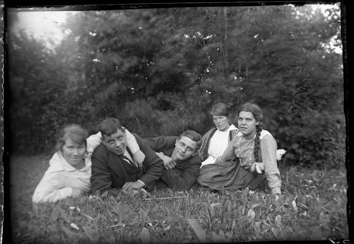 Två män och tre kvinnor i gräset. Längst till vänster, Julia Westergren.