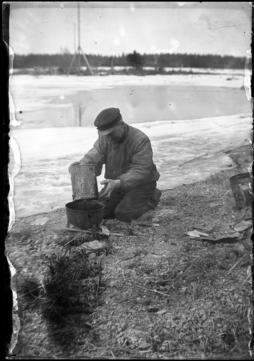 En man vid stranden, som troligtvis röker fisk med hjälp av järngryta och röklåda.