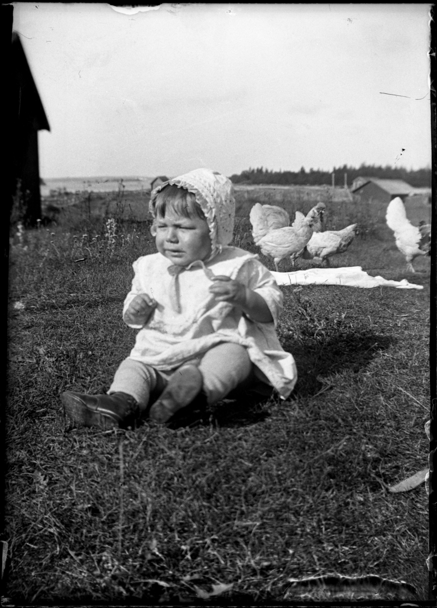 Ett litet barn sitter ute i gräset, omgiven av höns.