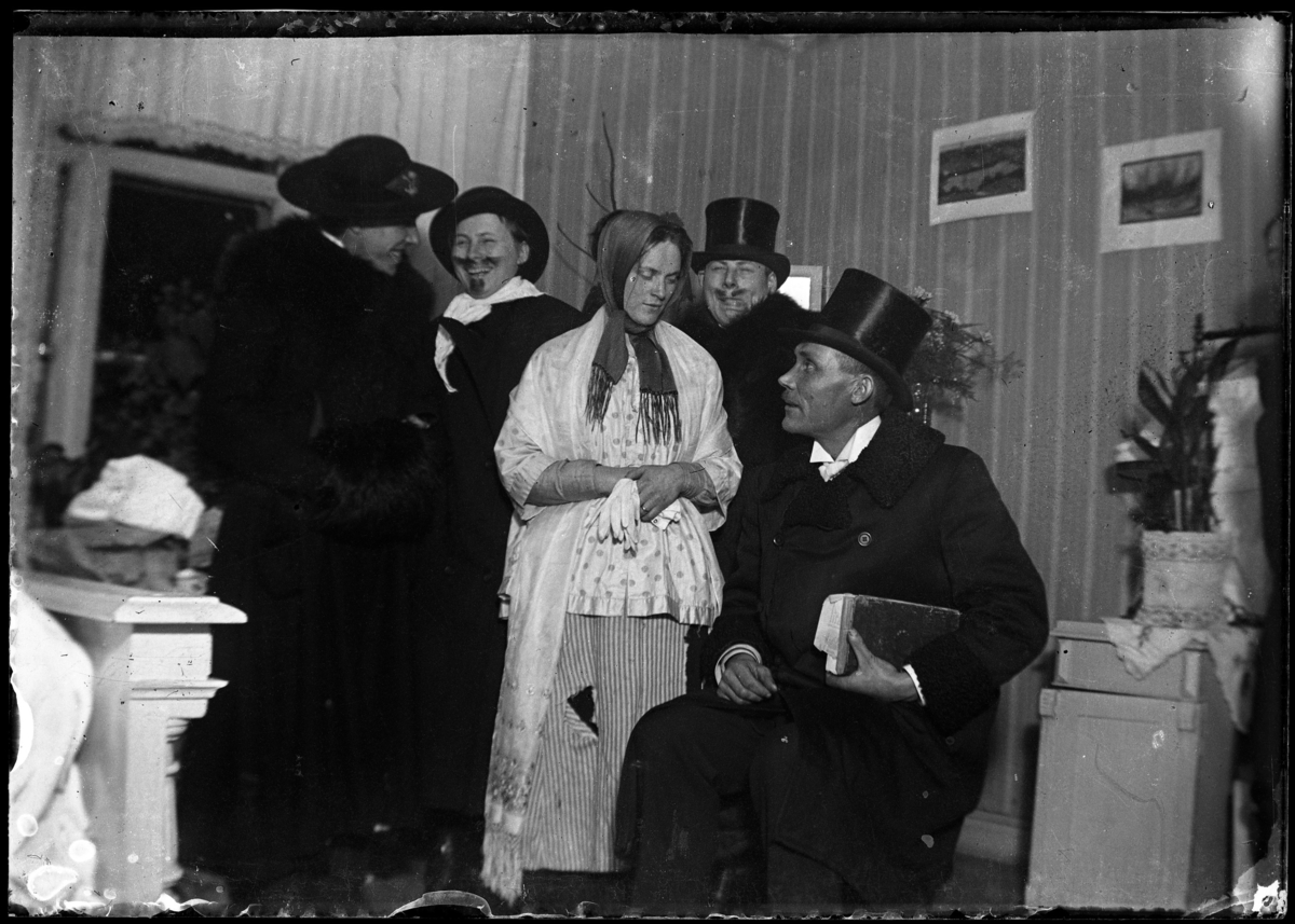 Fyra män och en kvinna utklädda, troligtvis inför maskerad eller teateruppträdande.