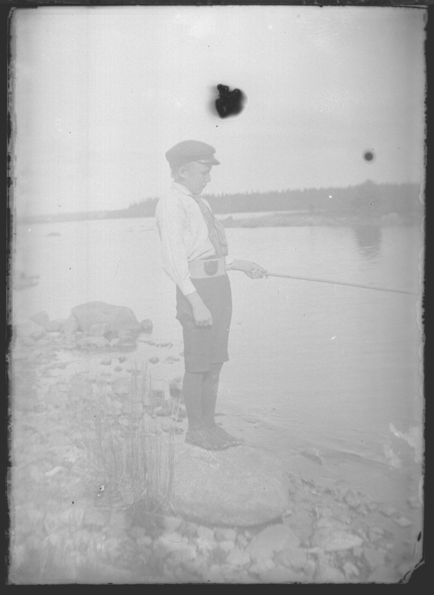 En pojke står vid stranden och metar.