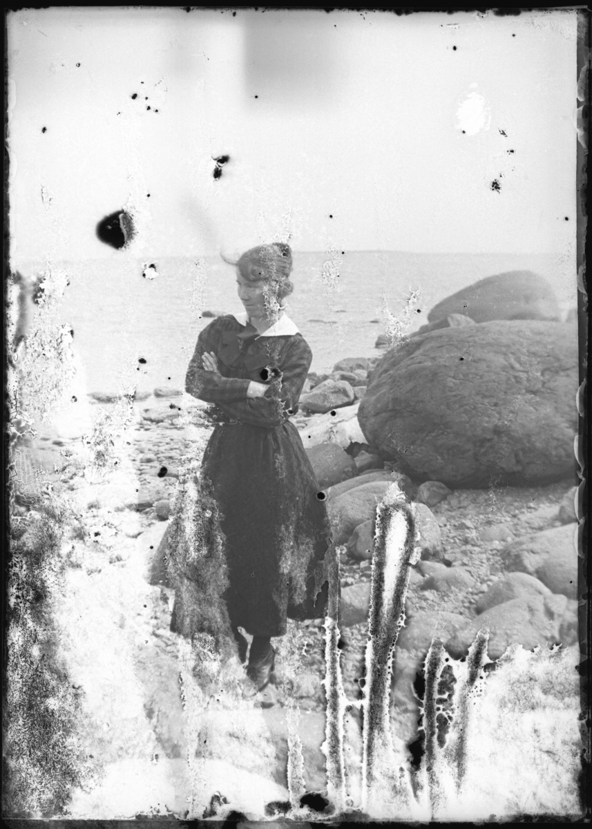 En kvinna i klänning på stenig strand.
