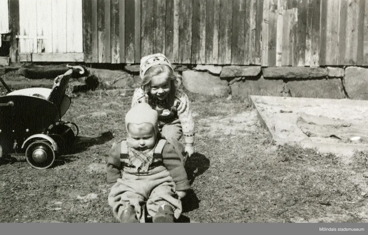 Eva Pettersson (gift Kempe) leker med sin lilla kusin Stina Krantz, Stretered år 1946. De var på besök hos mormor/farmor och morfar/farfar.