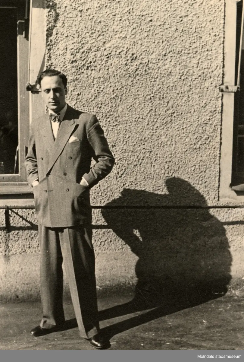 Hans Sander står framför SOABS vägg cirka 1946 - 1947. Han var givarens första chef på SOAB . Sander och Gilsenius gjorde även lumpen tillsammans.